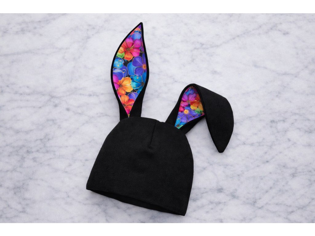 Stylová dětská čepice s roztomilými králičími oušky, která zaujme na první pohled. Zvenku je elegantně černá, uvnitř oušek se skrývá výrazný duhový květinový vzor, který dodává čepici hravost a originalitu.