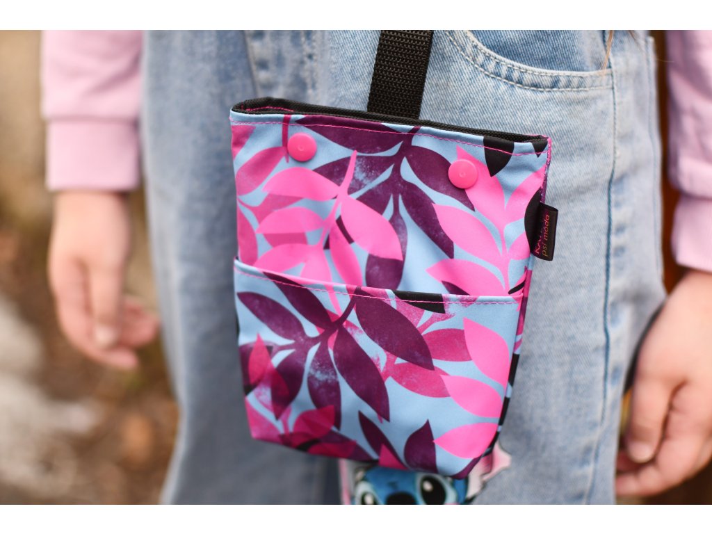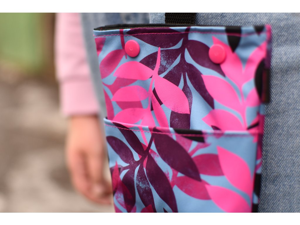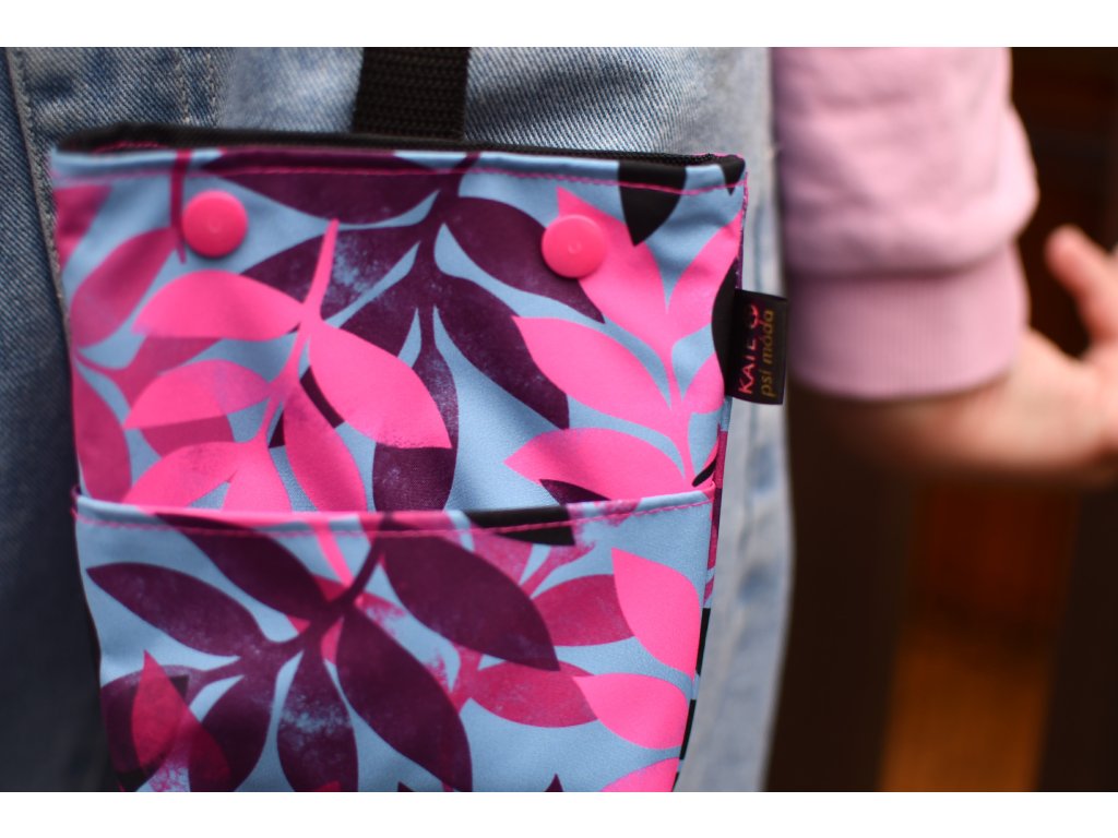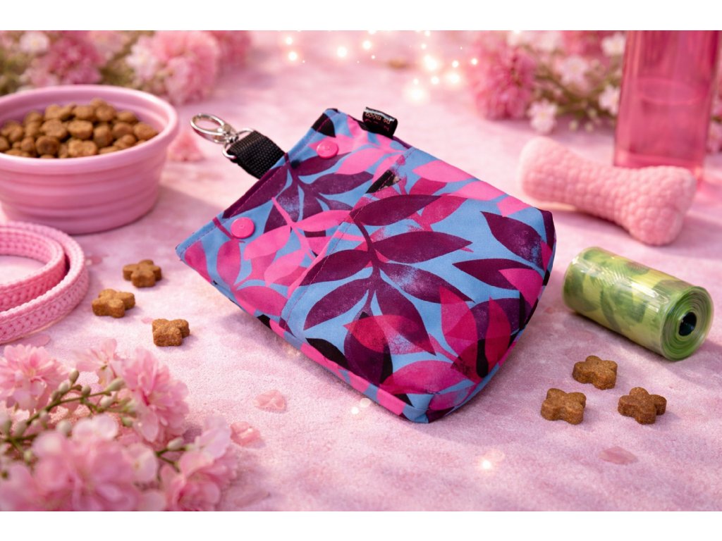 Pamlskovník má jednu velkou hlavní kapsu na pamlsky a menší přední kapsu například na sáčky nebo drobnosti. Zapínání je řešeno pevnými druky, které drží obsah bezpečně uvnitř a zároveň umožňují rychlé otevření jednou rukou.