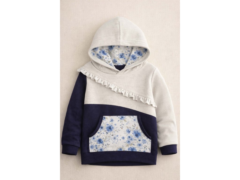 Romantická dívčí mikina v jemném růžovém odstínu, která zaujme propracovanými detaily. Spodní část mikiny a vnitřek kapuce zdobí květinový vzor, který krásně ladí s jednobarevným vrškem. Volánek v pase a na rukávech dodává mikině něžný, dívčí vzhled.
