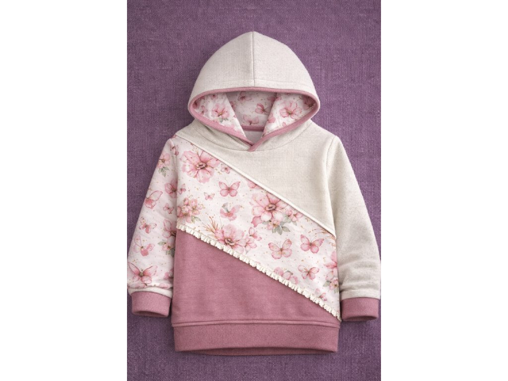 Romantická dívčí mikina v jemném růžovém odstínu, která zaujme propracovanými detaily. Spodní část mikiny a vnitřek kapuce zdobí květinový vzor, který krásně ladí s jednobarevným vrškem. Volánek v pase a na rukávech dodává mikině něžný, dívčí vzhled.