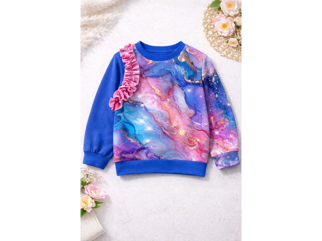 Volánky dodávají mikině jemný, dívčí vzhled a z obyčejného outfitu udělají krásný a pohodlný komplet. Mikina se snadno kombinuje s legínkami, tepláčky i sukýnkou.
