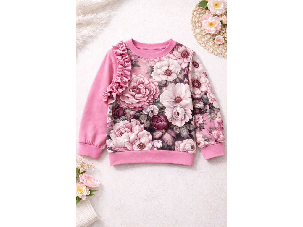 Volánky dodávají mikině jemný, dívčí vzhled a z obyčejného outfitu udělají krásný a pohodlný komplet. Mikina se snadno kombinuje s legínkami, tepláčky i sukýnkou.