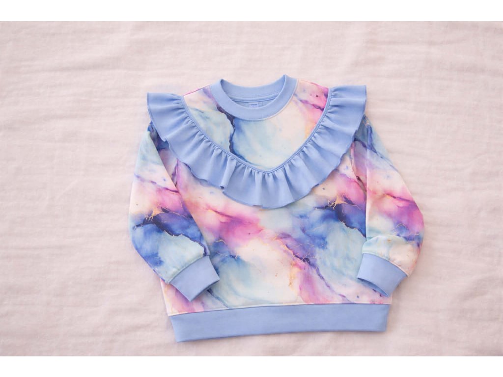 Volánky dodávají mikině jemný, dívčí vzhled a z obyčejného outfitu udělají krásný a pohodlný komplet. Mikina se snadno kombinuje s legínkami, tepláčky i sukýnkou.