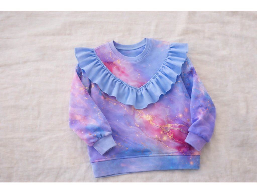 Volánky dodávají mikině jemný, dívčí vzhled a z obyčejného outfitu udělají krásný a pohodlný komplet. Mikina se snadno kombinuje s legínkami, tepláčky i sukýnkou.