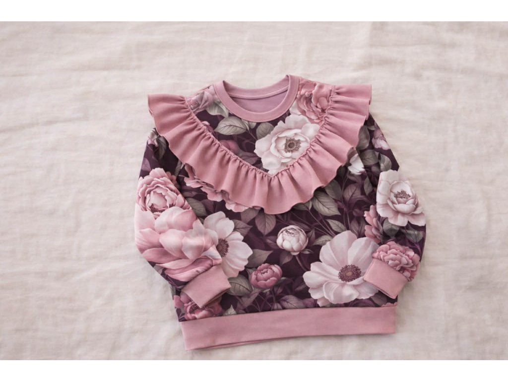 Volánky dodávají mikině jemný, dívčí vzhled a z obyčejného outfitu udělají krásný a pohodlný komplet. Mikina se snadno kombinuje s legínkami, tepláčky i sukýnkou.
