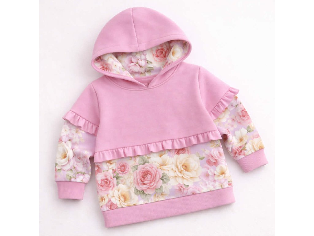 Romantická dívčí mikina v jemném růžovém odstínu, která zaujme propracovanými detaily. Spodní část mikiny a vnitřek kapuce zdobí květinový vzor, který krásně ladí s jednobarevným vrškem. Volánek v pase a na rukávech dodává mikině něžný, dívčí vzhled.