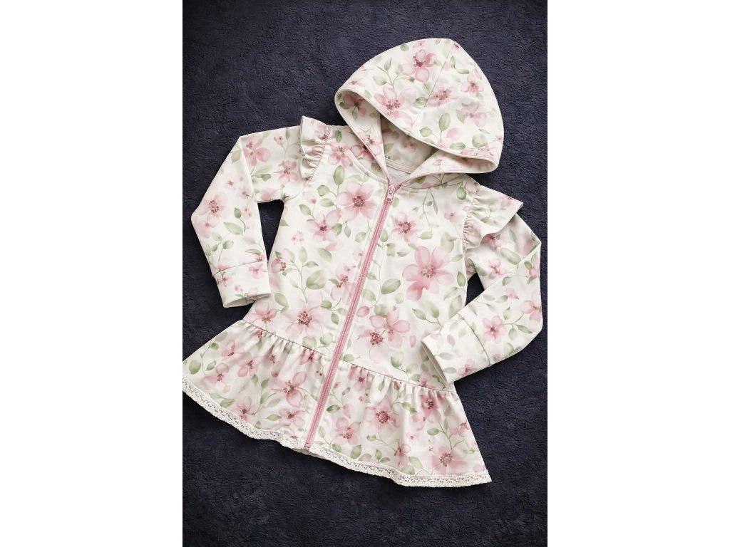 Střih s lehce prodlouženým spodním lemem a krajkovým zakončením dodává mikině něžný vzhled a zároveň poskytuje dostatek pohodlí při pohybu. Skvěle se hodí na procházky, do školky i na běžné nošení.
