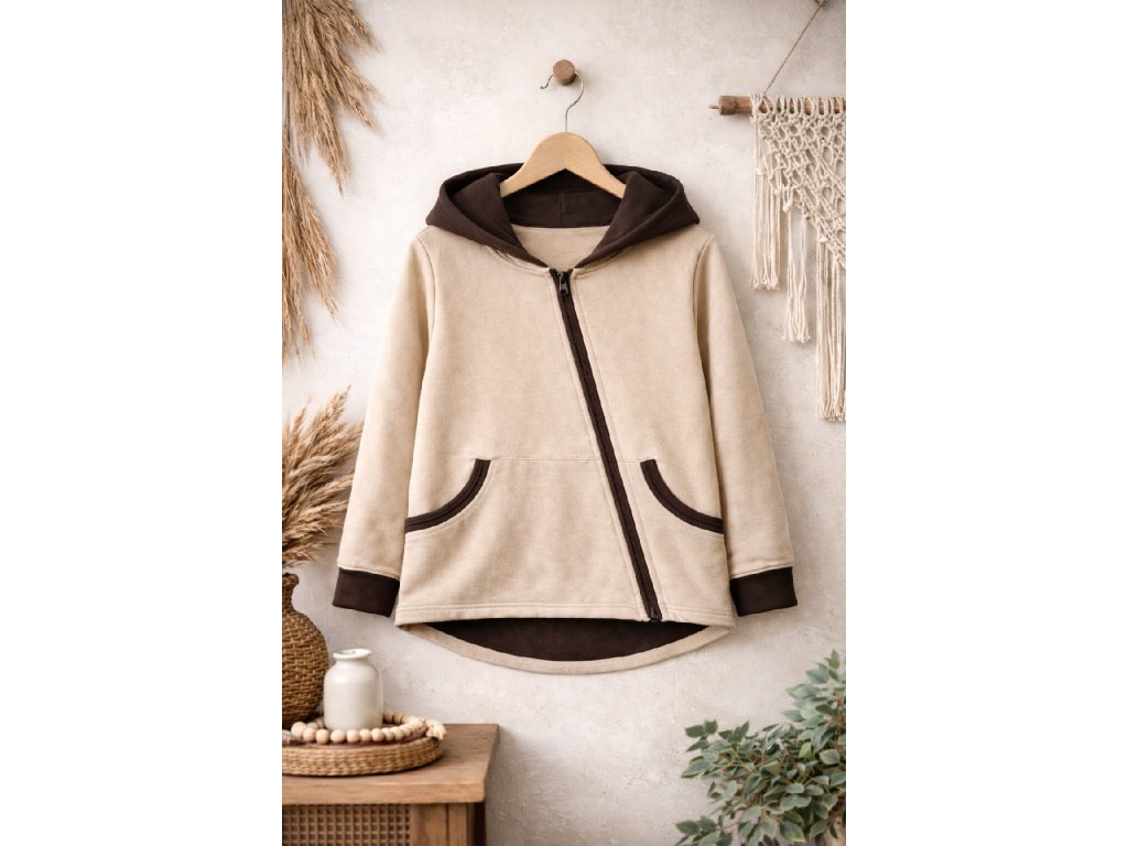 Prodloužený zadní díl chrání záda před chladem a velká kapsa pojme všechny dětské poklady. Autorský vzor v kombinaci s jednobarevnými detaily dělá z mikiny nepřehlédnutelný kousek do školky, školy i na ven.