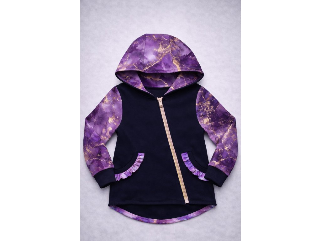 Prodloužený zadní díl chrání záda před chladem a velká kapsa pojme všechny dětské poklady. Autorský vzor v kombinaci s jednobarevnými detaily dělá z mikiny nepřehlédnutelný kousek do školky, školy i na ven.