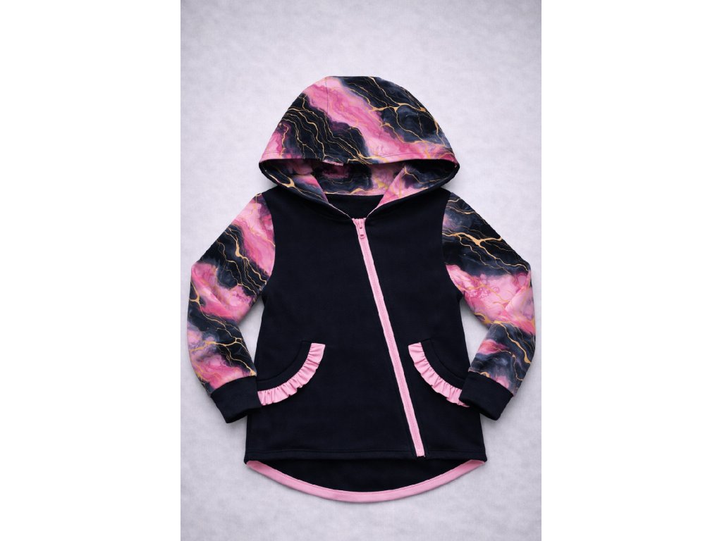 Prodloužený zadní díl chrání záda před chladem a velká kapsa pojme všechny dětské poklady. Autorský vzor v kombinaci s jednobarevnými detaily dělá z mikiny nepřehlédnutelný kousek do školky, školy i na ven.