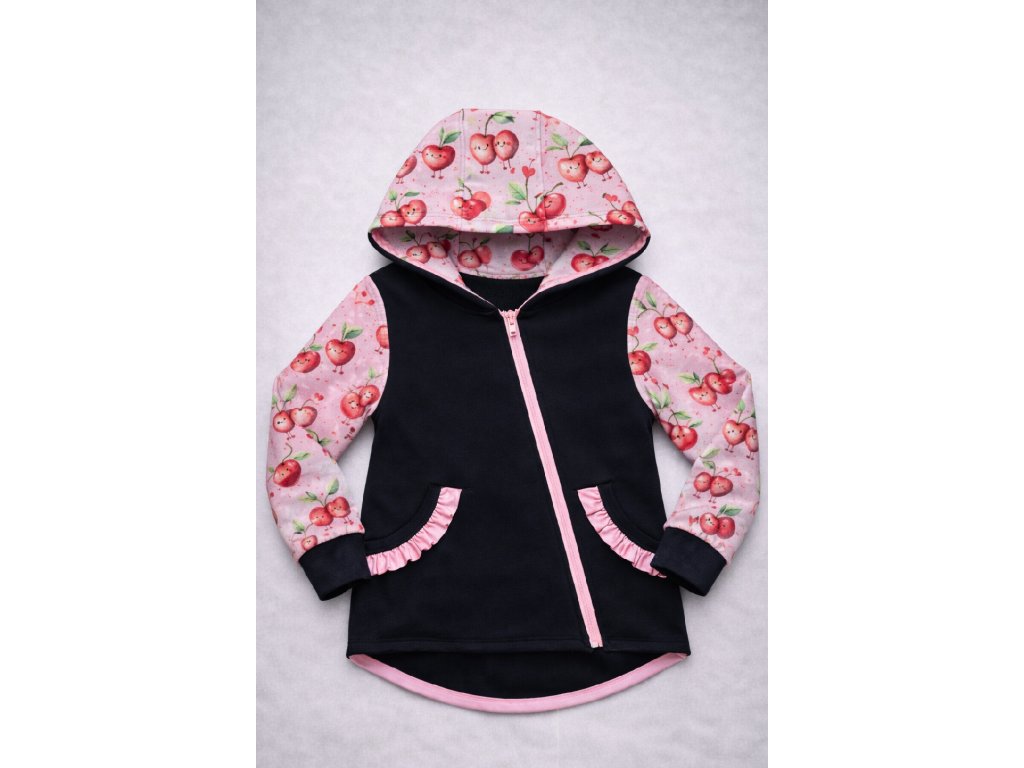 Prodloužený zadní díl chrání záda před chladem a velká kapsa pojme všechny dětské poklady. Autorský vzor v kombinaci s jednobarevnými detaily dělá z mikiny nepřehlédnutelný kousek do školky, školy i na ven.