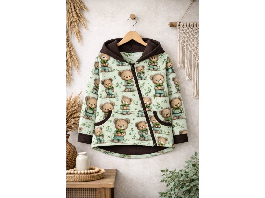 Prodloužený zadní díl chrání záda před chladem a velká kapsa pojme všechny dětské poklady. Autorský vzor v kombinaci s jednobarevnými detaily dělá z mikiny nepřehlédnutelný kousek do školky, školy i na ven.