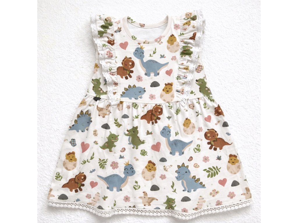 Něžné bavlněné šaty s romantickým květinovým vzorem a bohatými volánky na ramenou jsou ideální volbou pro malé princezny. Lehký, příjemný materiál je měkký na dotek a pohodlný na nošení po celý den. Střih s mírně nabíranou sukýnkou krásně splývá a neomezuje děti v pohybu.