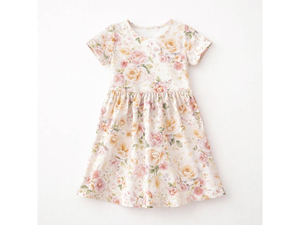 Něžné bavlněné šaty s romantickým květinovým vzorem a bohatými volánky na ramenou jsou ideální volbou pro malé princezny. Lehký, příjemný materiál je měkký na dotek a pohodlný na nošení po celý den. Střih s mírně nabíranou sukýnkou krásně splývá a neomezuje děti v pohybu.