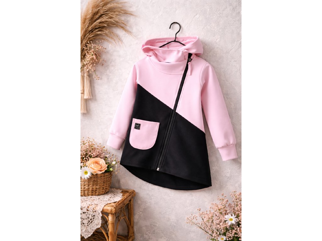 Asymetrické zapínání na zip dodává moderní vzhled, prodloužený zadní díl krásně kryje záda a kapuce ochrání před větrem. Ideální na jaro, podzim i chladnější letní dny.