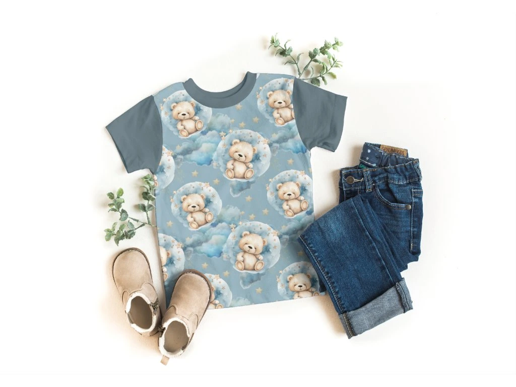 Hravé a originální motivy dodávají tričku jedinečný vzhled a děti si ho rychle oblíbí. Střih je navržený tak, aby seděl a vydržel i aktivní dětský den. Velkou výhodou je možnost ušití trička i z jiného vzoru z naší kolekce – snadno tak sladíš sourozence nebo vytvoříš kousek přesně podle svých představ.