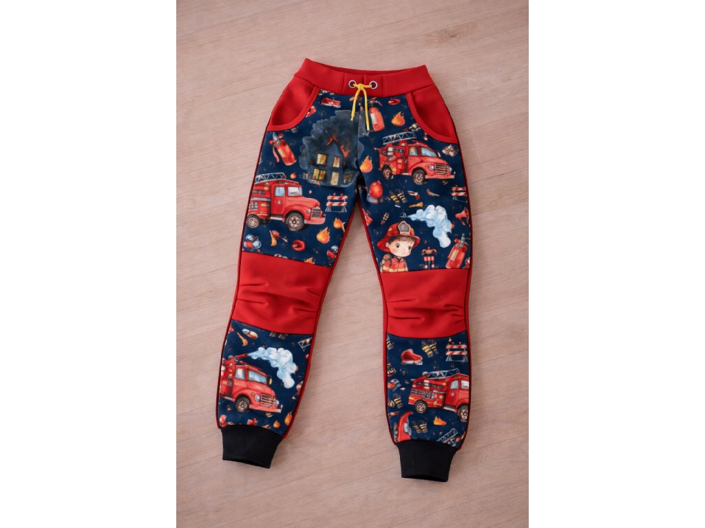 Kalhoty jsou vyrobeny z kvalitního voděodolného softshellu, který chrání proti větru a vlhkosti a zároveň zůstává prodyšný. Vnitřní strana je standardně zateplená fleecem pro tepelný komfort, na přání je možné ušití i s teplým beránkem, vhodným do chladnějších podmínek.